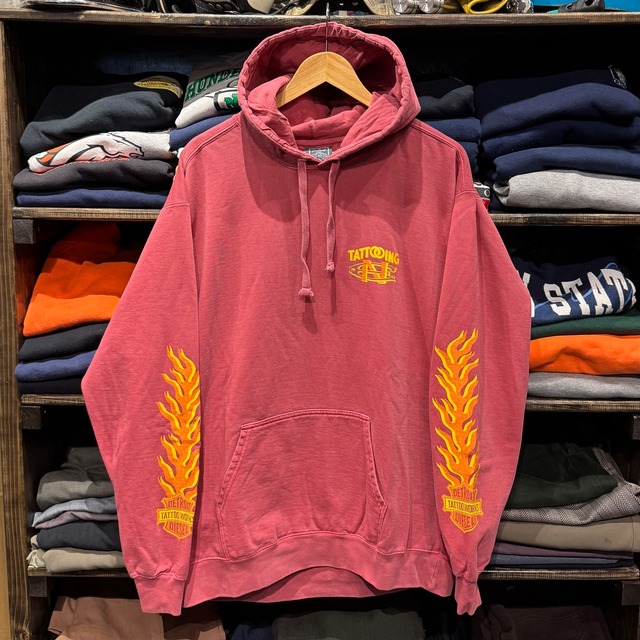 Detroit Diesel Tattoo WorksのENさんの オリジナルプリントアイテムを 新年初売り商材として入荷!!! フェード加工のボディを使用して、 古着にも合わせやすい使い勝手◎なパーカー! クラシックなアメリカントラディショナルスタイルの彫り師であるENさんの描く、 100年以上前のアメリカントラッドタトゥーをモチーフにしたデザイン。 クラシックな蛇とイーグルのタトゥーフラッシュ+ハーレーのバーアンドシールドのパロディのバックプリント。 フロントはお馴染みENさんロゴ。 スリーブには男前なフレイムス。 まさに着るタトゥー。 周りと被らない。 こんなデザイン欲しかった。 そう思える一品です。 店主もよく着ているので、 見たことある人もいるかも? バイカーや、タトゥー好きに着てほしい1着! 実寸 M 身幅:56cm 身丈:69cm 裄丈:88cm L 身幅:62cm 身丈:72cm 裄丈:90cm XL 身幅:64cm 身丈:75cm 裄丈:93cm